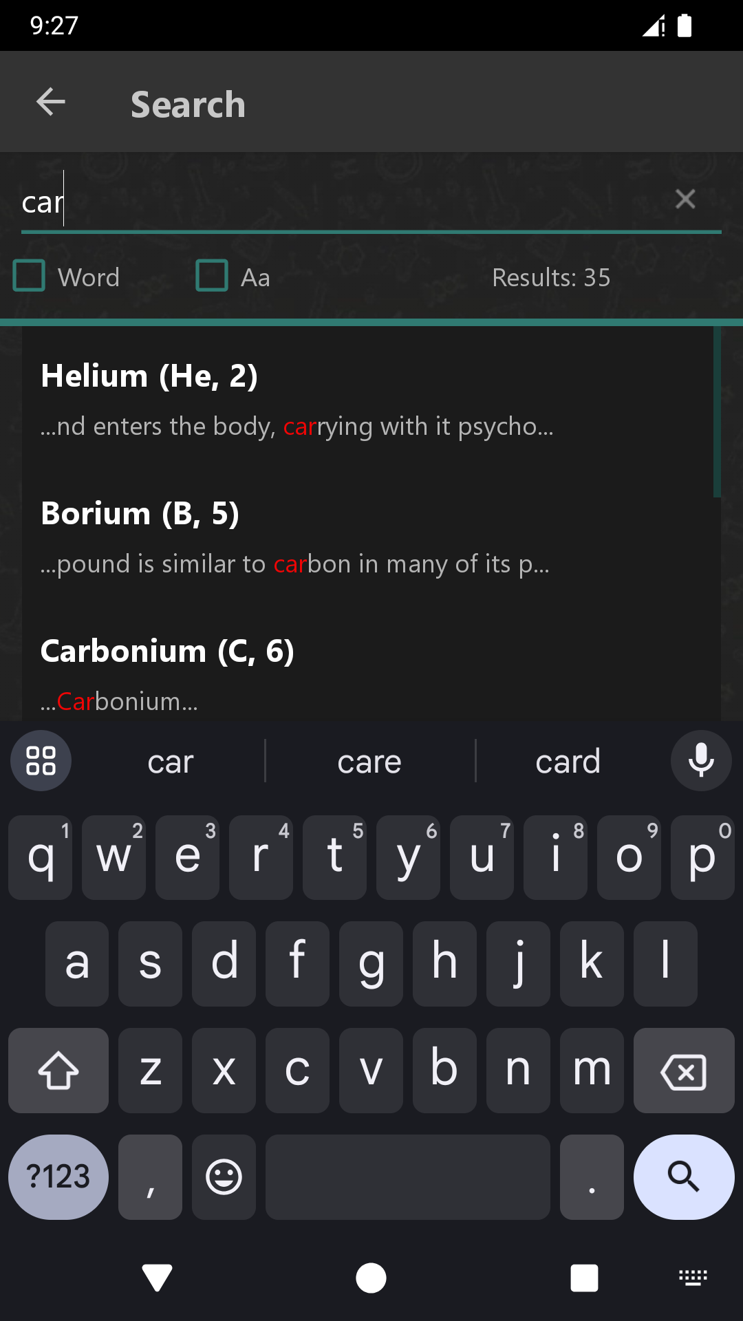 ⇨ Elementlərin təsvirində istifadə olunmuş istənilən sözün axtarışı