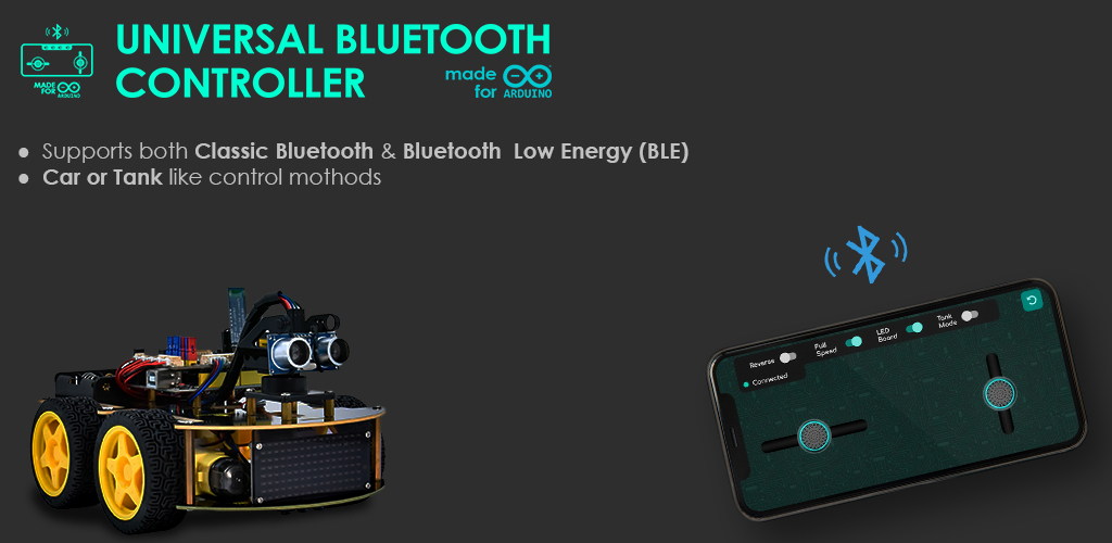 Primarily made to work with Keyestudio 4WD BT Robot Car V2.0 Kit for Arduino, but should work with any Arduino based robot with wheels or caterpillars tracks.